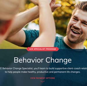 ACE Behavior Change Specialist ProgramThe ACE Behavior Change Specialist Program presents the key tools to promoting behavior change and creating a foundation for a healthy lifestyle. You will learn how to help clients of all backgrounds recognize counterproductive behaviors and coach them to discover new methods to move more, eat better and make healthier decisions for themselves and their families. |